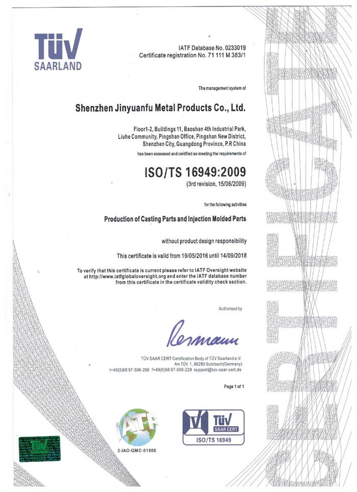深圳市金源福五金制品有限公司成立于2003年。公司擁有8000多平方米生產(chǎn)廠地、開發(fā)與管理精英人才、技術(shù)專業(yè)、設(shè)備精良、交通便利、服務(wù)周全、具體設(shè)計(jì)、開發(fā)、制模、出樣、生產(chǎn)到成品出貨一體化模式生產(chǎn)廠家。已通過ISO9001:2008ISO1440/TS16949:2009國際質(zhì)量體系認(rèn)證。專業(yè)生產(chǎn)鋅合金壓鑄、鋁合金壓鑄產(chǎn)品、汽車配件、汽車后視鏡支架、車載導(dǎo)航散熱器、LED散熱器、LED燈罩、數(shù)碼電子五金結(jié)構(gòu)件、家具五金裝飾件、標(biāo)牌(LOGO)等五金壓鑄產(chǎn)品。